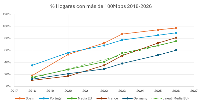 - España ocupa el primer puesto la UE en cobertura de redes de muy alta capacidad (más de 100 Mbps): España ha alcanzado prácticamente el 100% de cobertura de banda ancha (redes de más de 100 Mbps) en 2025, cumpliendo los objetivos de la Agenda España Digital antes de lo previsto, más de 20 puntos por encima de la media de la UE.